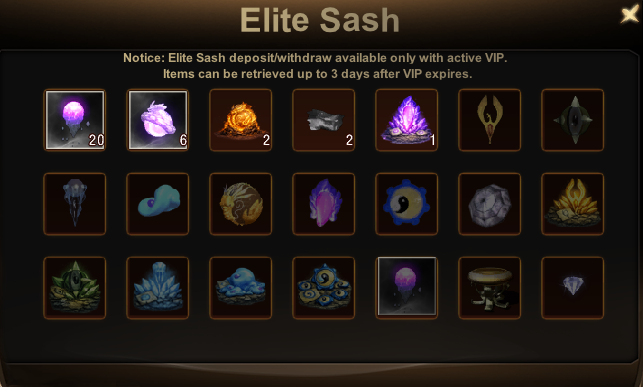 The Elite Sash is a special storage system in TOW Conquer unlocked at VIP 4. Any items obtained from loot or activities will automatically go to the Elite Sash, keeping your inventory safe and organized.